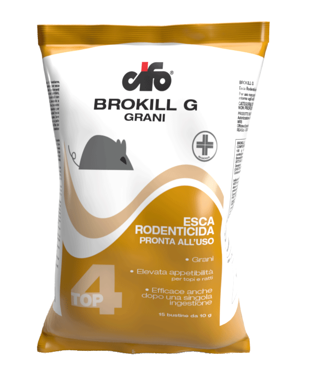 Esca rodenticida in grani, pronta all’uso, a base di Bromadiolone, sostanza attiva anticoagulante, efficace contro il Topolino domestico (Mus musculus) e il Ratto grigio (Rattus Norvegicus). Può essere utilizzato all’interno e all’esterno intorno agli edifici rurali, civili, abitazioni, cantine, garage, ripostigli, giardini di pertinenza. Efficace, provocano anche dopo una singola ingestione, la morte dei roditori. La formulazione consiste in cereali particolarmente attraenti e appetibili per le specie di roditori riportate. Brokill G è in pratiche bustine pronte all’uso. Il prodotto contiene un agente amaricante volto ad evitare l’ingestione accidentale da parte di bambini e animali non bersaglio.