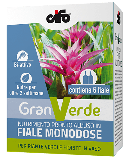 Granverde concime in fiale bi-attiva monodose contiene il nutrimento necessario per tutte le piante in vaso sia da interno che da esterno, la parte contenente la soluzione color azzurro ha funzione nutriente, per assicurare alle piante tutti gli elementi necessari al loro sviluppo, quella di colore verde ha funzione rinvigorente, per garantire una crescita veloce e una rigogliosa fioritura.