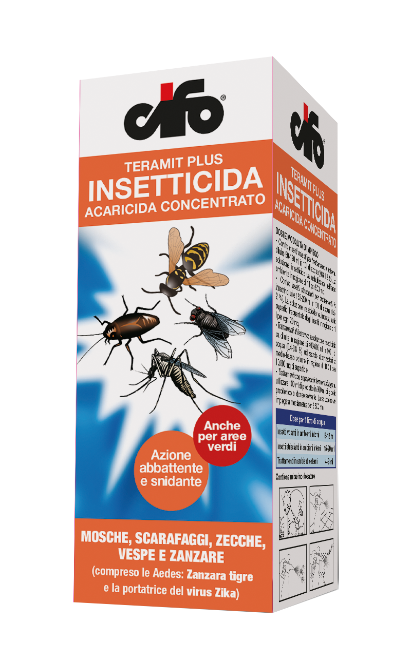 TERAMIT PLUS è un insetticida-acaricida formulato in microemulsione acquosa che agisce per contatto e ingestione con azione abbattente e snidante ed elevata persistenza. TERAMIT PLUS è indicato per ambienti interni ed esterni sia pubblici, civili, che rurali e industriali. L’uso è anche previsto per trattamenti nelle aree verdi, viali alberati, cespugli e siepi, tappeti erbosi, per il solo trattamento contro le zanzare. TERAMIT PLUS è un insetticida attivo contro un vasto numero di insetti volanti tra cui mosche, zanzare, flebotomi, vespe e striscianti tra cui blatte e zecche.