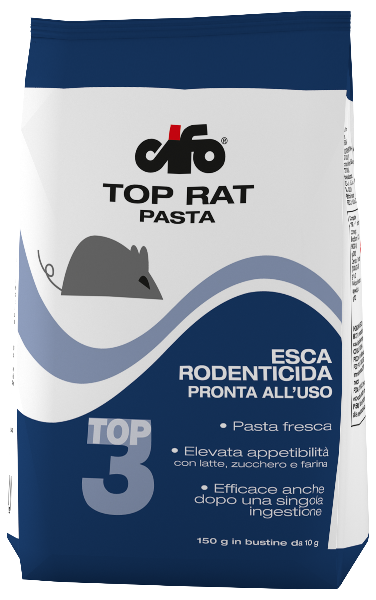Esca rodenticida pronta all’uso in pasta fresca, a base di Brodifacoum, sostanza attiva anticoagulante, efficace contro il Topolino domestico (Mus musculus) e il Ratto grigio (Rattus Norvegicus). Ideale per l’utilizzo in ambienti domestici all’interno ed esterno di edifici, quali abitazioni, cantine, garage, ripostigli e giardini di proprietà. Le esche sono arricchite con sostanze adescanti che ne aumentano l’appetibilità e l’attrattività. Caratterizzate da elevata efficacia, provcoano, anche dopo una sola ingestione, la morte dei roditori. Top Rat Pasta è in pratiche bustine pronte all’uso, prodotto sicuro e facile da usare. Le esche contengono una sostanza amaricante, non percepita dai roditori, che evita l’ingestione accidentale dell’esca da parte di bambini o animali non bersaglio.